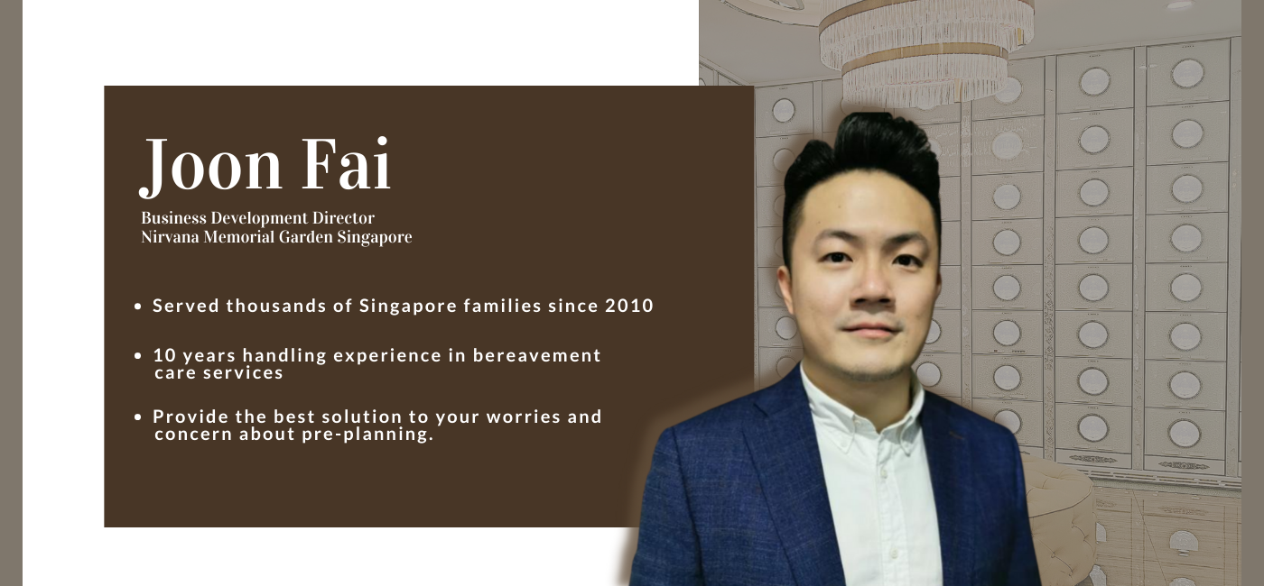 As one of the Top funeral directors in Singapore – Mr Joon Fai advises the family on possible final breaks for their deceased loved ones when they do not know what to do after the bodies are cremated. In Singapore, placing ashes in the ossuary also means a decision and decision to choose a private or government-run ossuary. The niche needs to decide on a \”convenient\” location, what kind of urn and what kind of plaque to use.